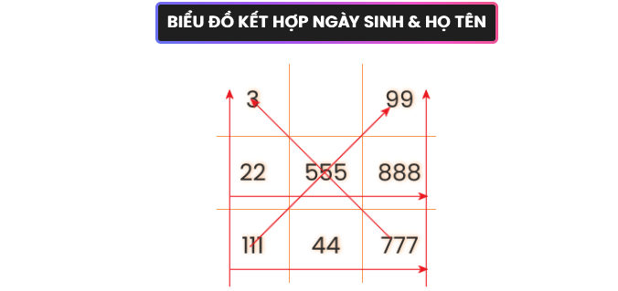 Sau khi kết hợp biểu đồ ngày sinh và tên riêng của mình vào, các bạn đã vô tình điền thêm nhiều con số để lấp đầy các chỗ bị thiếu của mình, bạn đã được điền thêm các mũi tên: mũi tên hoạt động (đủ 789) vào biểu đồ của mình. Tuy nhiên đối với chỗ nào quá nhiều số được điền vào bạn nên tìm hiểu kỹ ý nghĩa các mũi tên đó và tập cân bằng, chỗ nào dư nên nhổ bớt và thiếu nên điền vào bằng nhiều cách khác nhau.